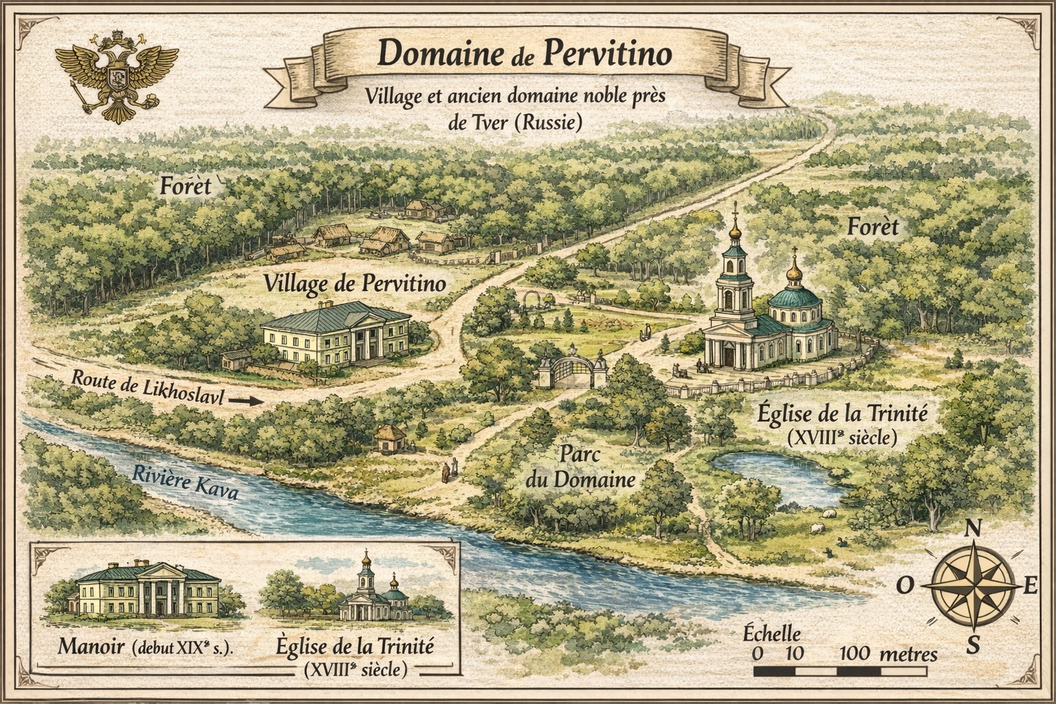 Pervitino, a property of Sophie Khvostov's family. In 1917, the family was forced to leave, the estate was confiscated and shared between the peasants, its church abandoned, but restored in 2018 and returned to worship. Watch the video and the plan of the estate.