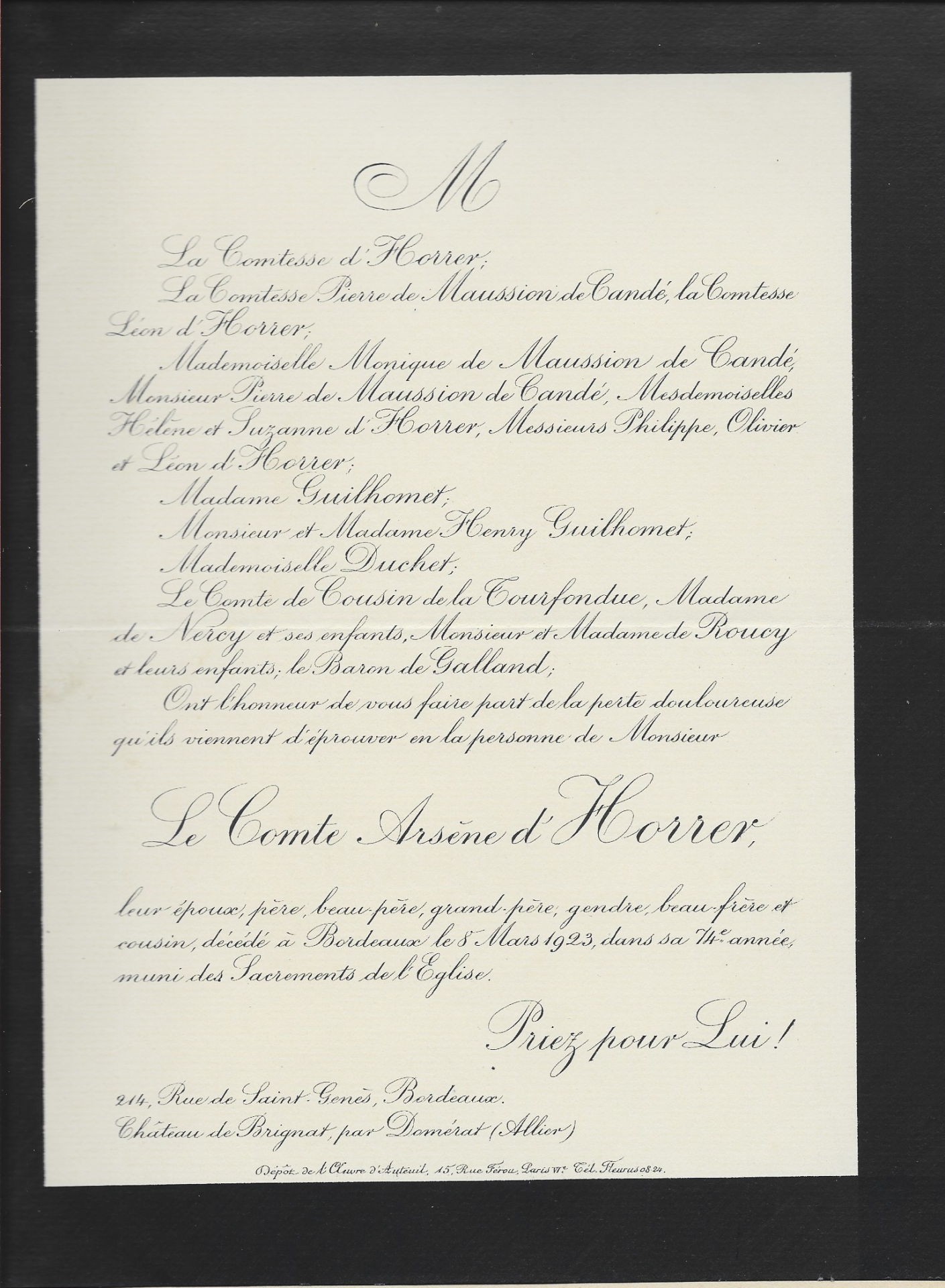 Поселившись после своей женитьбы в Монлюсоне (департамент Алье) и в находящемся неподалёку замке Бринья, он скончался в Бордо 8 марта 1923 года в возрасте 74 лет (док-19.1 : извещение о смерти Арсена д’Оррера).